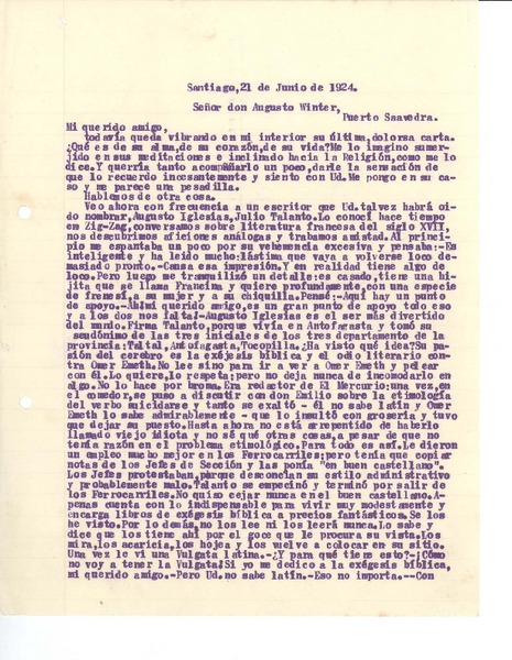 [Carta] 1924 jun. 21, Santiago, Chile [a] Augusto Winter [manuscrito] Hernán Díaz Arrieta.