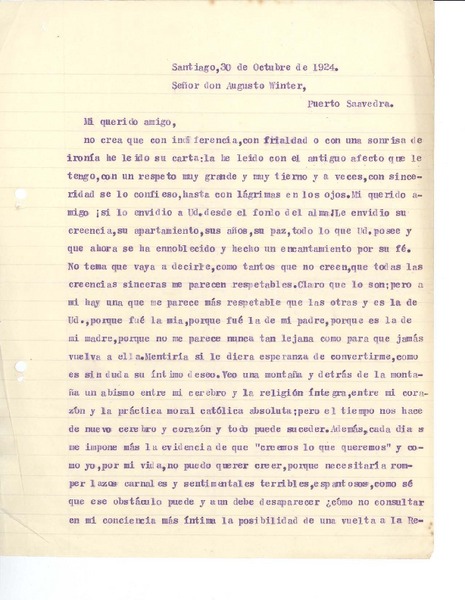 [Carta] 1924 oct. 30, Santiago, Chile [a] Augusto Winter [manuscrito] Hernán Díaz Arrieta.