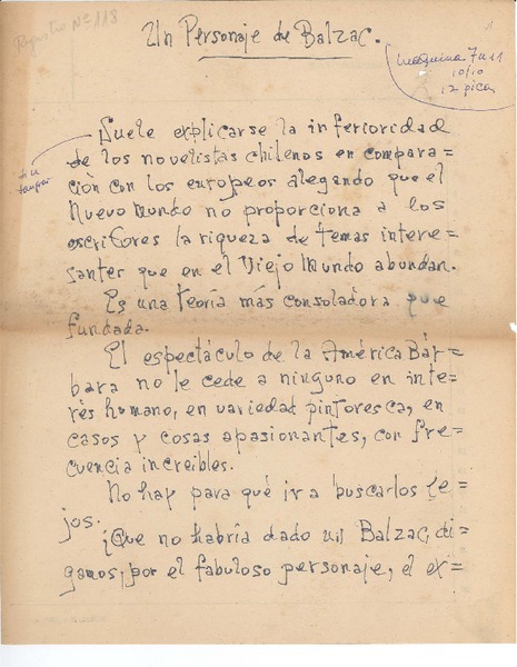 Un personaje de Balzac [manuscrito] Hernán Díaz Arrieta.