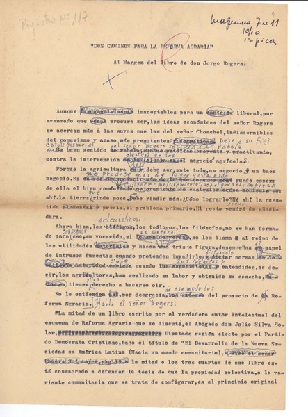 Dos caminos para la reforma agraria [manuscrito] Hernán Díaz Arrieta.
