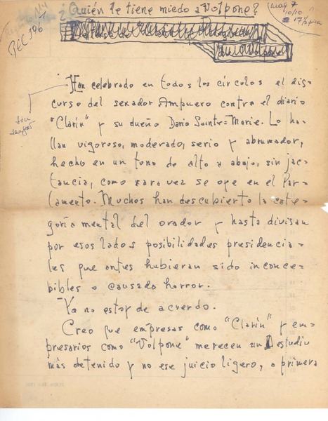 Quién le tiene miedo a Volpone? [manuscrito] Hernán Díaz Arrieta.