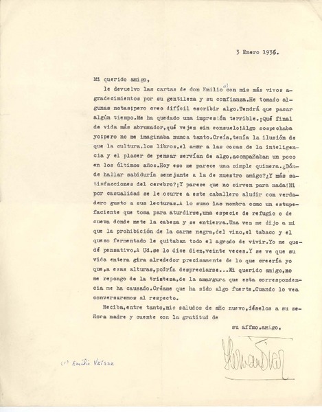 [Carta] 1936 ene. 3, Santiago, Chile [a] Pedro Prado [manuscrito] Hernán Díaz Arrieta.