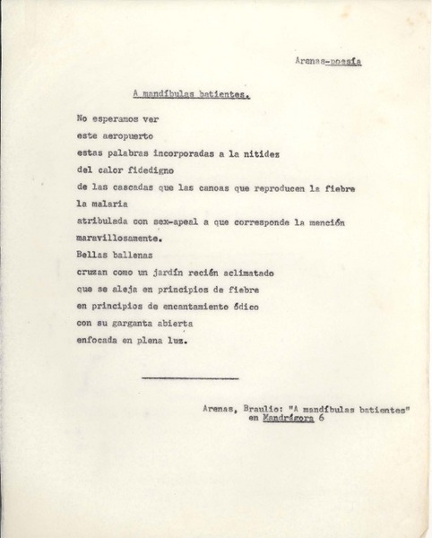 A mandíbulas batientes [manuscrito] Braulio Arenas.