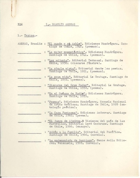 [Bibliografía] [manuscrito] Braulio Arenas.