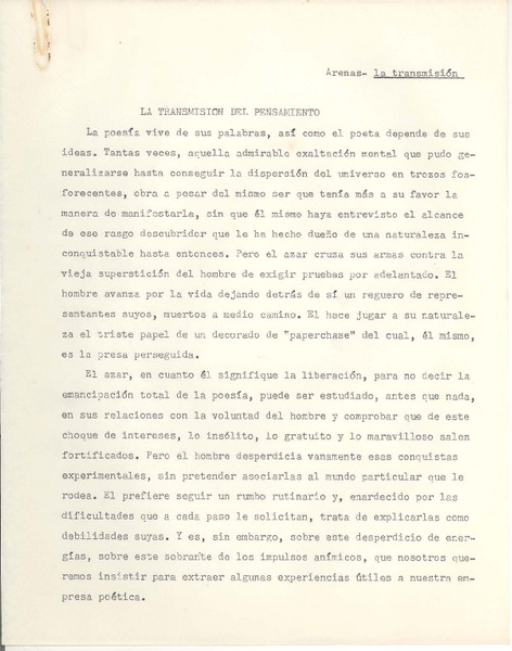 La transmisión del pensamiento [manuscrito] Braulio Arenas.