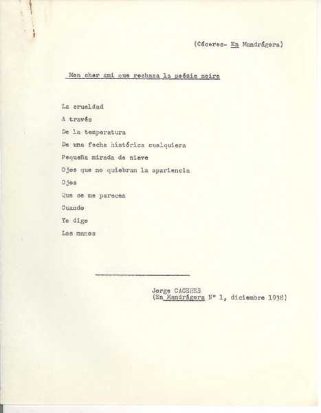 Mon cher ami que rechaza la poésie noire [manuscrito] Jorge Cáceres.