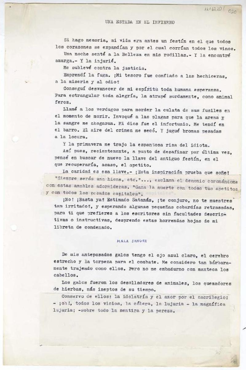 Una estada en el infierno [manuscrito] Arthur Rimbaud ; traducción de Braulio Arenas.