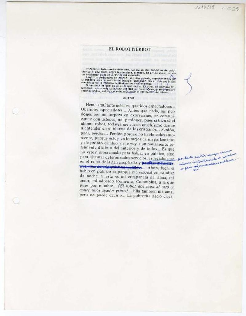 El robot Pierrot [manuscrito] Braulio Arenas.