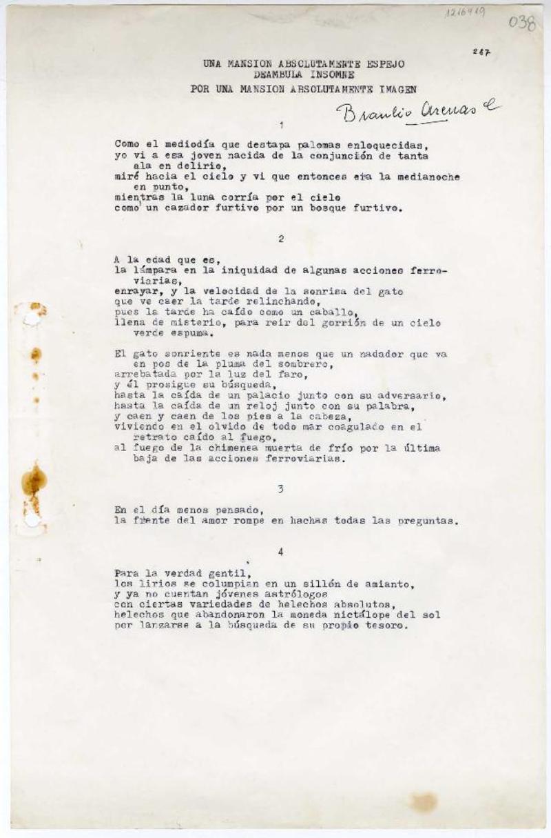 Una mansión absolutamente espejo deambula insomne por una mansión absolutamente imagen [manuscrito] Braulio Arenas.