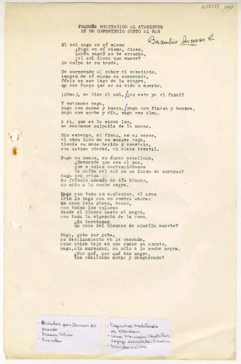 Pequeña meditación al atardecer en un cementerio junto al mar [manuscrito] Braulio Arenas.