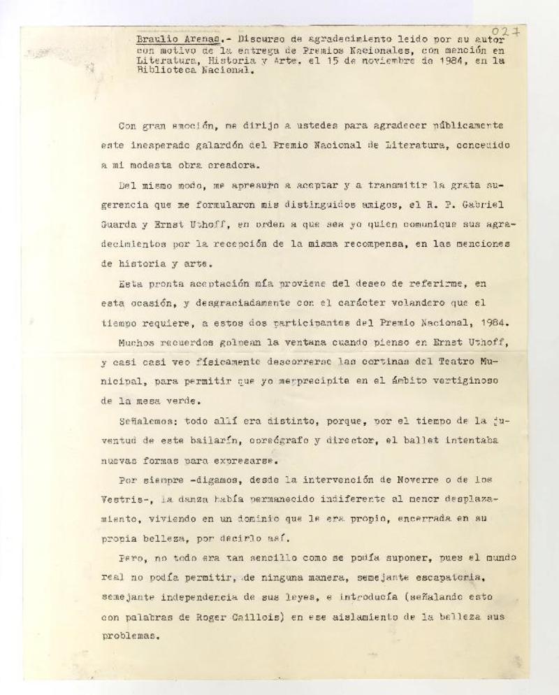Discurso de agradecimiento [manuscrito] Braulio Arenas.