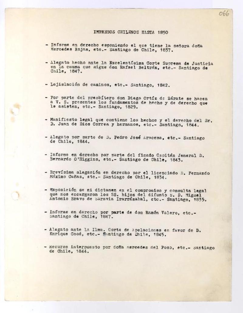 Listados de impresos chilenos entre 1837 hasta 1850 y siglo XIX [manuscrito] Braulio Arenas.
