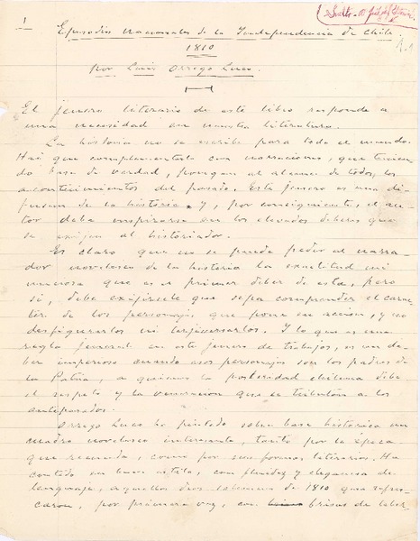 Episodios nacionales de la independencia de Chile [manuscrito] Gonzalo Bulnes.