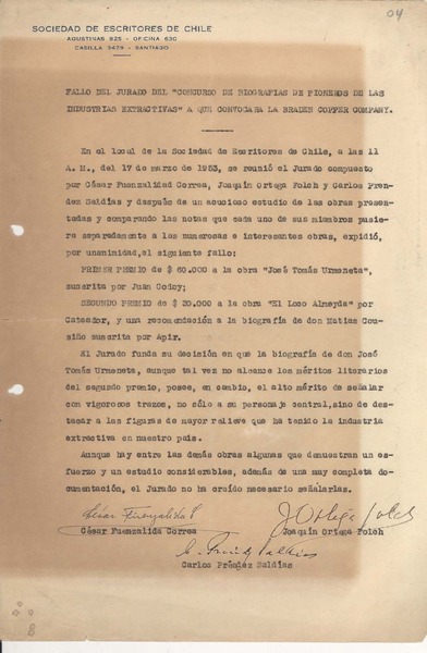[Oficio] 1953 mar. 17, Santiago, Chile [manuscrito] Carlos Préndez Saldías; César Fuenzalida Correa y Joaquín Folch.
