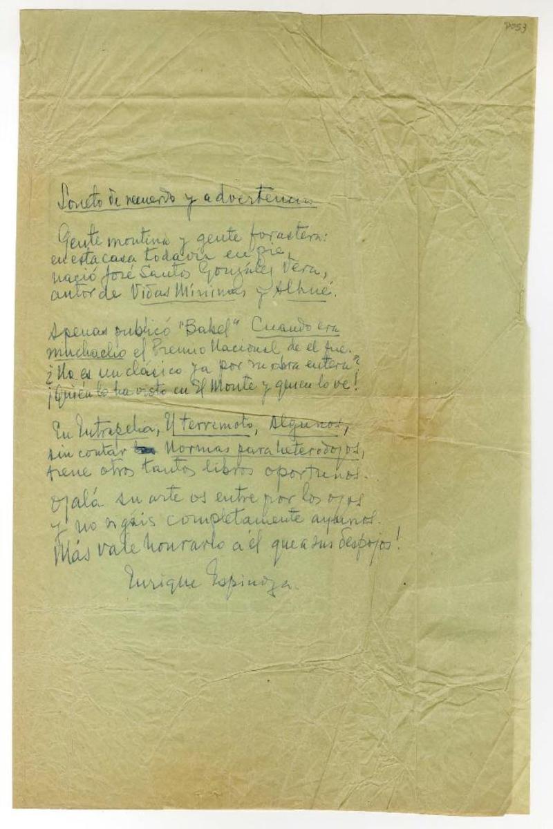 Soneto de recuerdo y advertencia, [manuscrito] Enrique Espinoza.