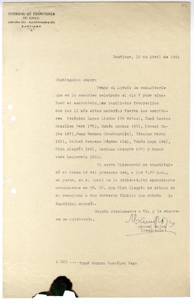 [Carta] 1941 octubre 25, Santiago Chile [a los] socios de la Sociedad de Escritores de Chile [manuscrito] José Santos González Vera.