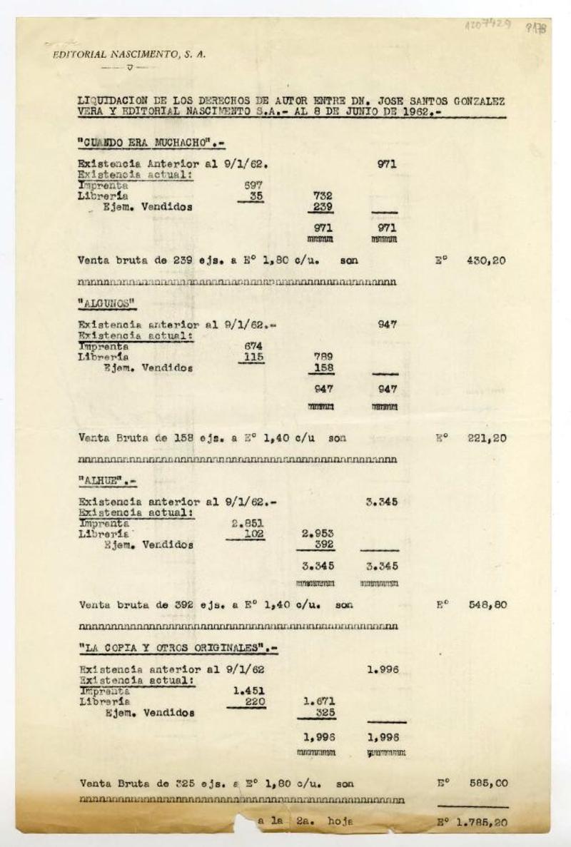 Santiago, Chile [a] José Santos González Vera Liquidaciones de derechos de autor, entre 1950 y 1962, [manuscrito] Editorial Nascimento S.A.