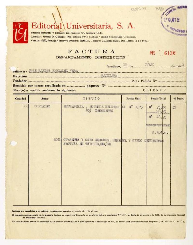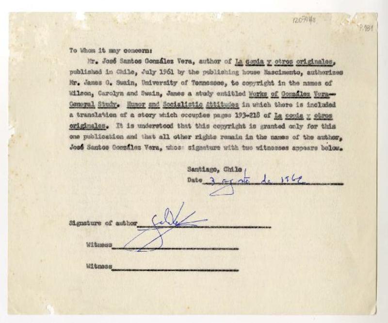 Santiago, Chile [a] José Santos González Vera Liquidaciones de derechos de autor, entre 1958 y 1961, [manuscrito] Editorial Universitaria (Chile).