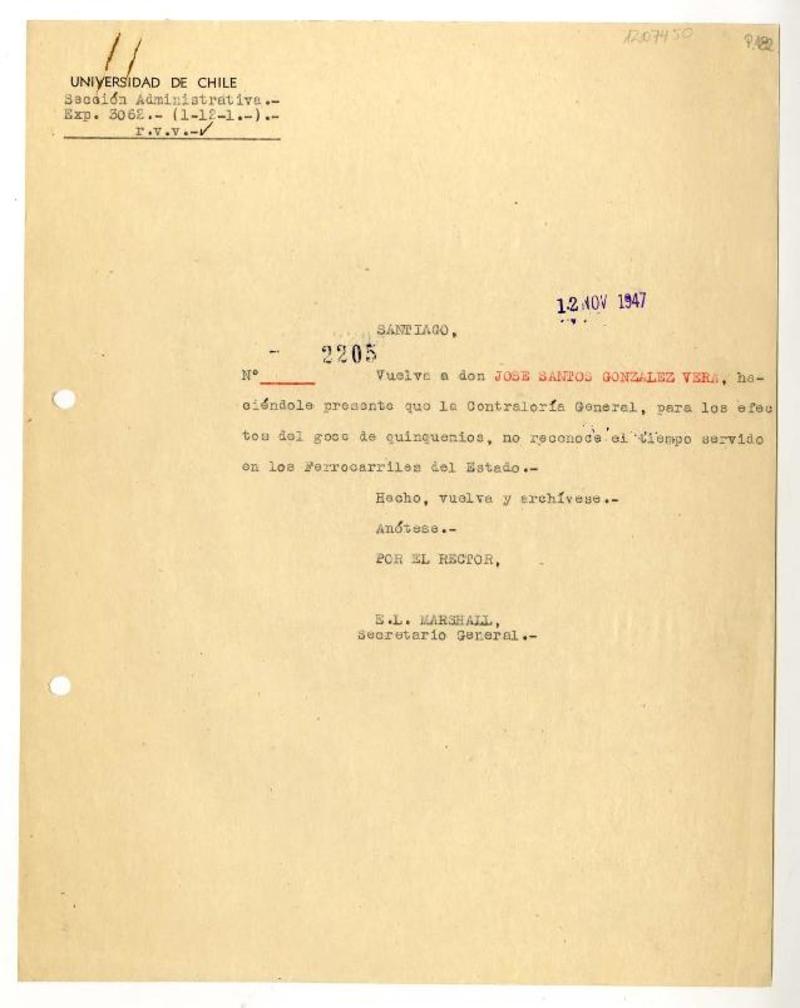 Santiago, Chile [a] José Santos González Vera Hoja de Servicio, 22 de enero 1947, [manuscrito] Ferrocarriles del Estado (Chile).