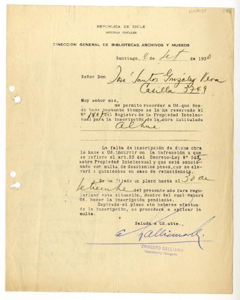 Santiago, Chile [a] José Santos González Vera Registros de derechos de autor, 4 de septiembre de 1930 y 30 de marzo de 1951, [manuscrito] Dirección General de Bibliotecas, Archivos y Museos.