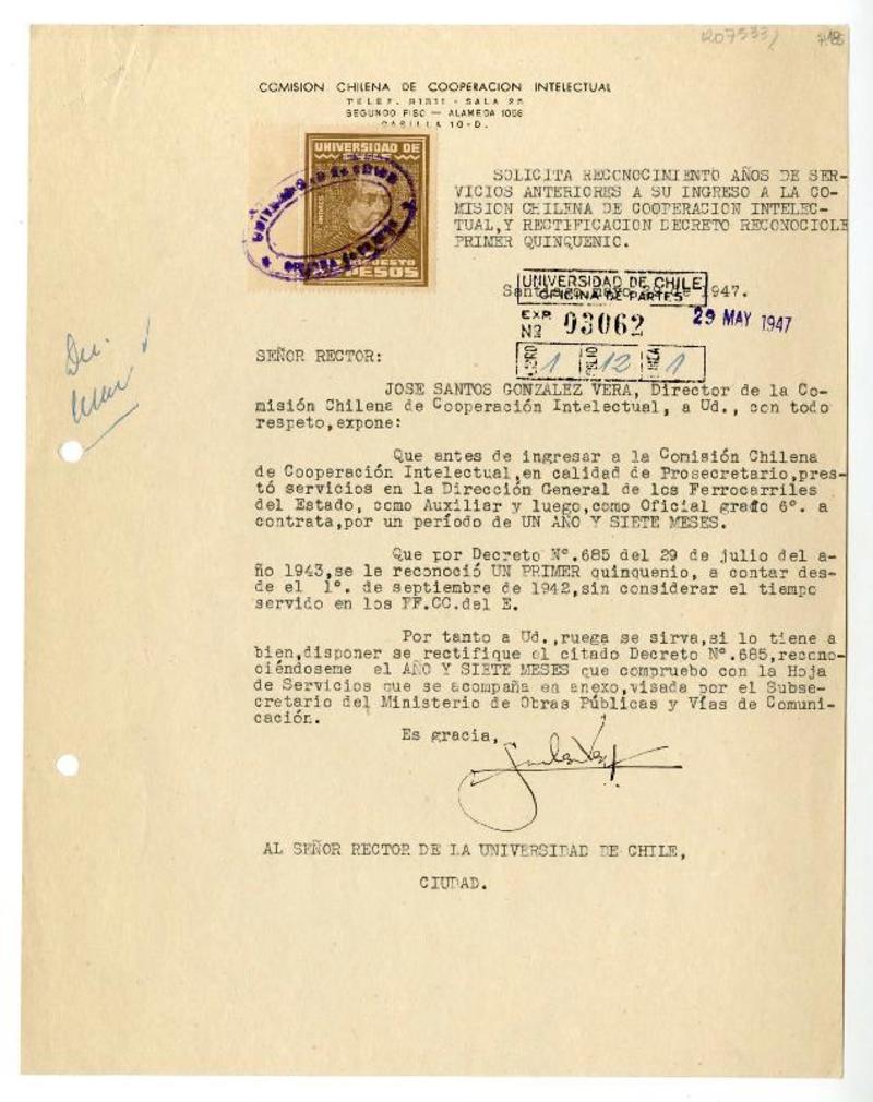 Santiago, Chile [a] José Santos González Vera Certificados, 12 de noviembre de 1947 y 6 de octubre de 1954, [manuscrito] Universidad de Chile y Caja de Previsión de Empleados Particulares.
