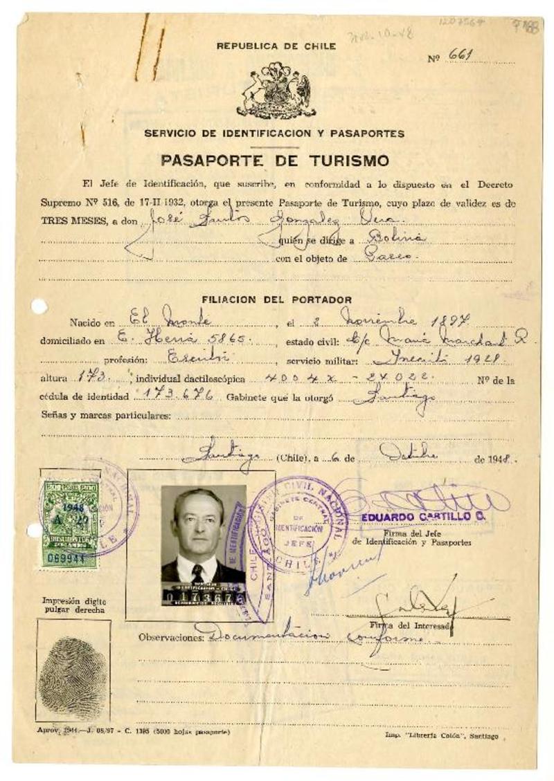 Santiago, Chile [a] José Santos González Vera Pasaporte de turismo, 6 de octubre de 1948, [manuscrito] Servicio de Identificación y Pasaportes (Chile).