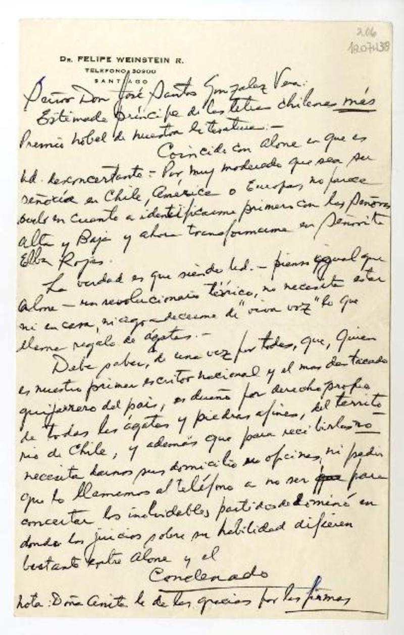 Santiago, Chile [a] José Santos González Vera Cartas, Entre 1938 y 1964, [manuscrito] Hernán Díaz Arrieta (Alone).