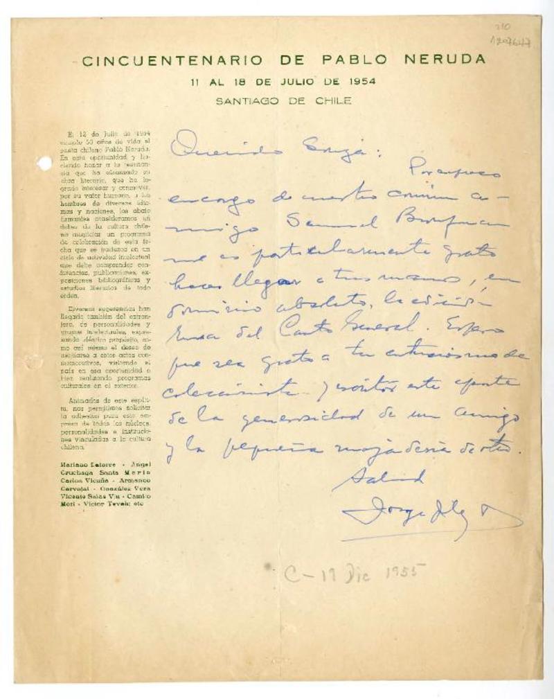 Buenos Aires, Argentina [a] José Santos González Vera Cartas, Entre agosto y octubre de 1954, [manuscrito] Enrique Espinoza.