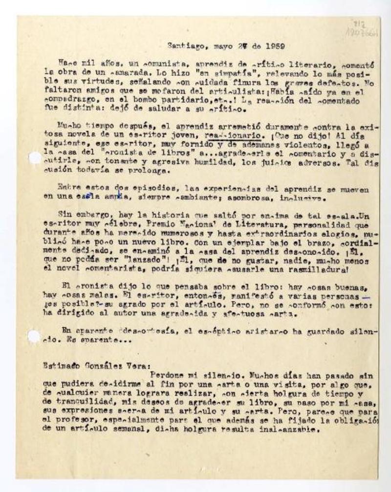 Chile [a] José Santos González Vera, Santiago, Chile Cartas, Abril y mayo de 1959, [manuscrito] Varios autores.