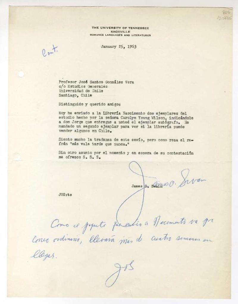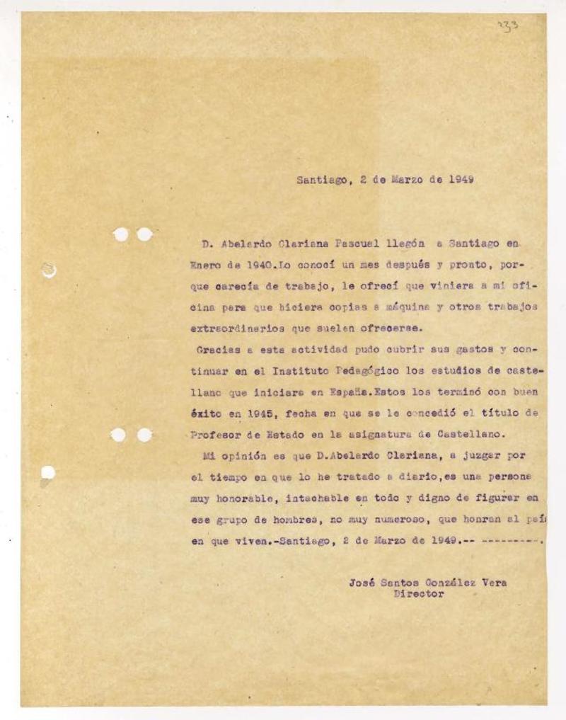Santiago, Chile [a] José Santos González Vera Certificado, 19 de enero de 1953, [manuscrito] Universidad de Chile.
