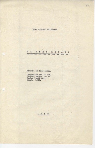 La hora robada [manuscrito] Luis Alberto Heiremans.