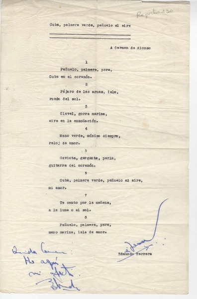 Cuba, palmera verde, pañuelo al aire [manuscrito] Edmundo Herrera.