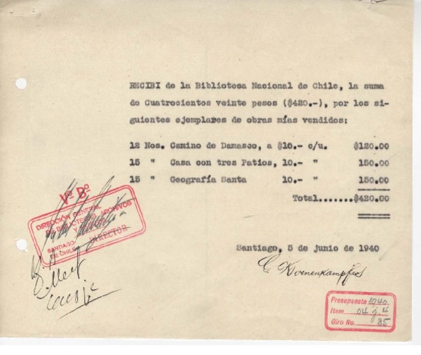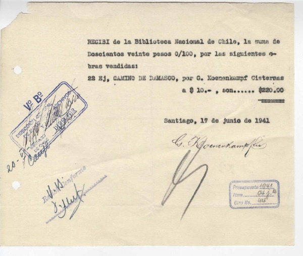 [Recibo] 1940 jun. 5, Santiago, Chile [a] Biblioteca Nacional de Chile [manuscrito] Guillermo Koenenkampf Cisternas.