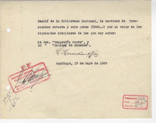 [Recibo] 1939 may. 17, Santiago, Chile [a] Biblioteca Nacional de Chile [manuscrito] Guillermo Koenenkampf.