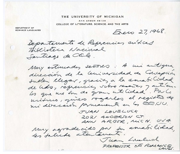 [Carta] 1968 enero 27, Michigan [a] Biblioteca Nacional de Chile [manuscrito] Juan Loveluck.