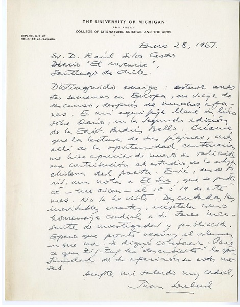 [Carta] 1967 enero 28, Michigan [a] Raúl Silva Castro [manuscrito] Juan Loveluck.