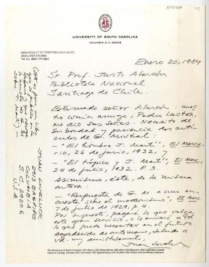 Columbia, South Carolina [a] Justo Alarcón Carta, 1984 enero 20, [manuscrito] Juan Loveluck.