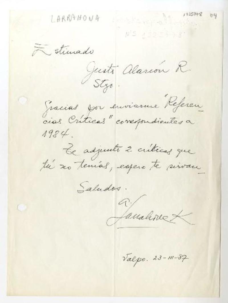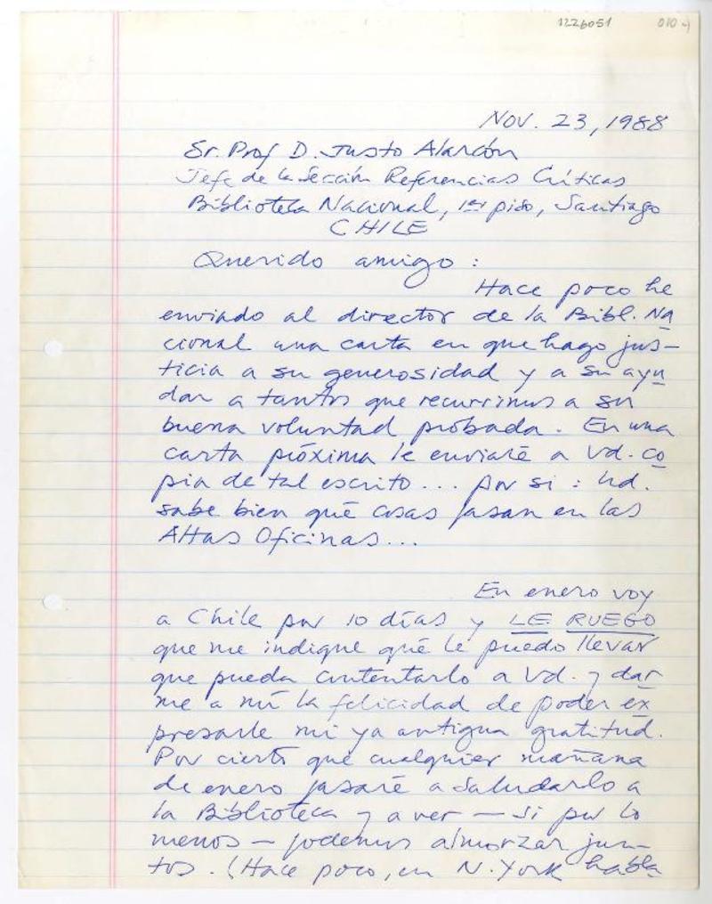 Columbia, South Carolina [a] Justo Alarcón Reyes Carta, 1988 noviembre 23, [manuscrito] Juan Loveluck.