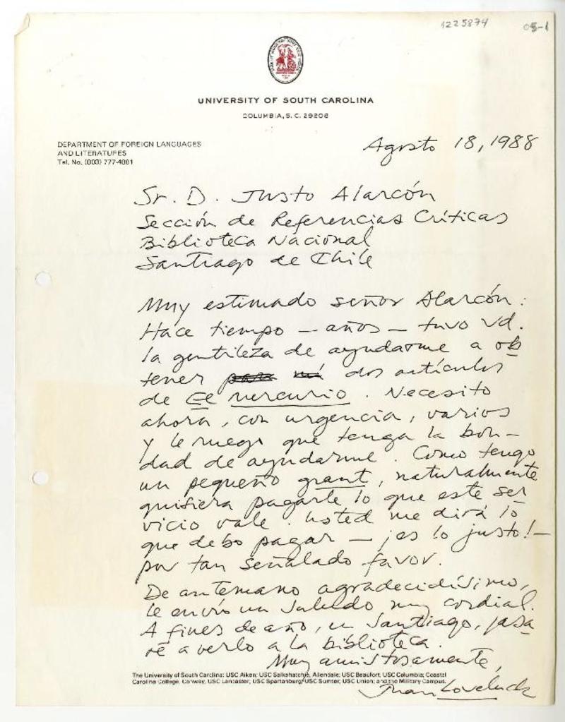 Columbia, South Carolina [a] Justo Alarcón Carta, 1988 agosto 18, [manuscrito] Juan Loveluck.