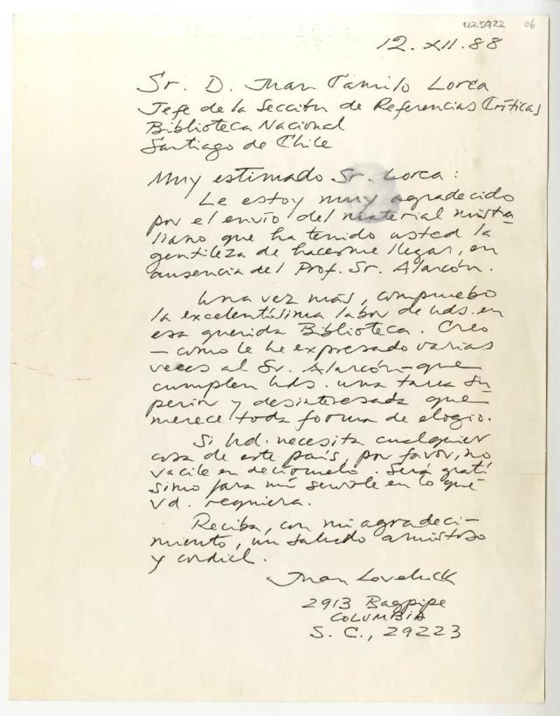 Colimbia, South Carolina [a] Juan Camilo Lorca Carta, 1988 diciembre 12, [manuscrito] Juan Loveluck.
