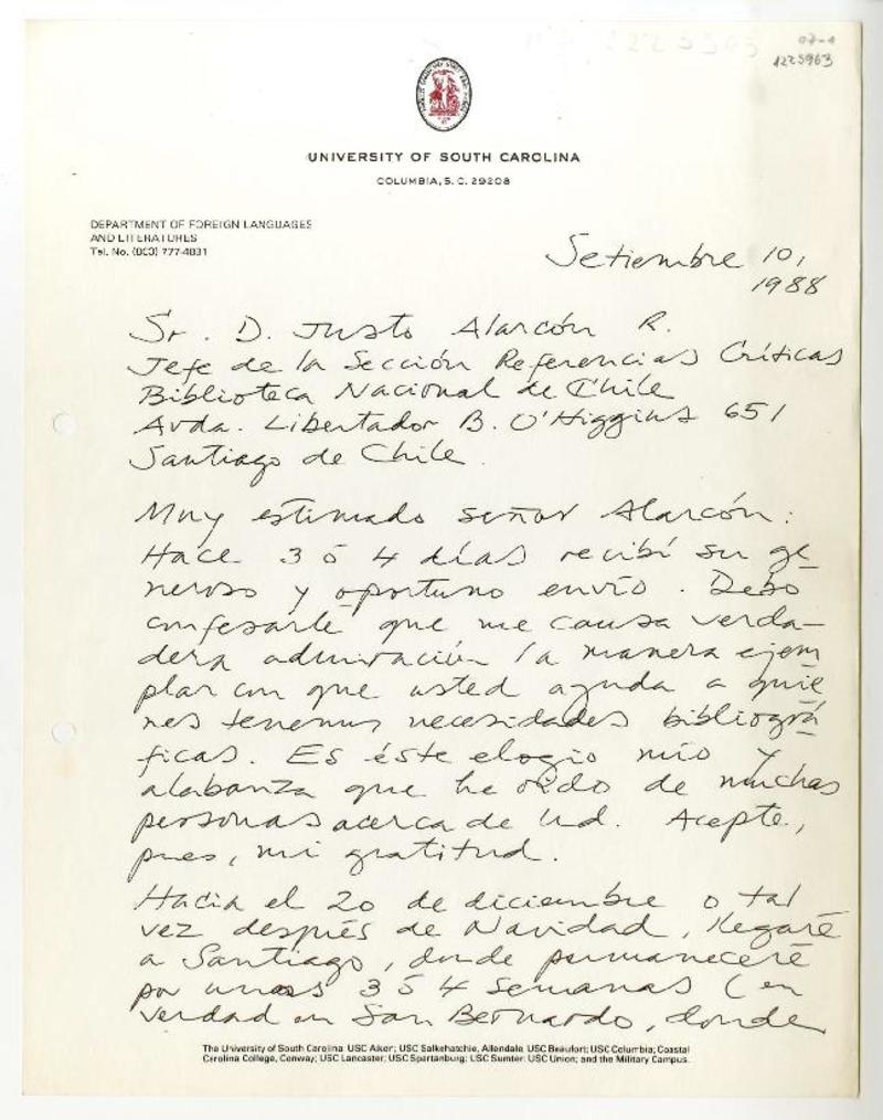 Columbia, South Carolina [a] Justo Alarcón Reyes Carta, 1988 septiembre 10, [manuscrito] Juan Loveluck.