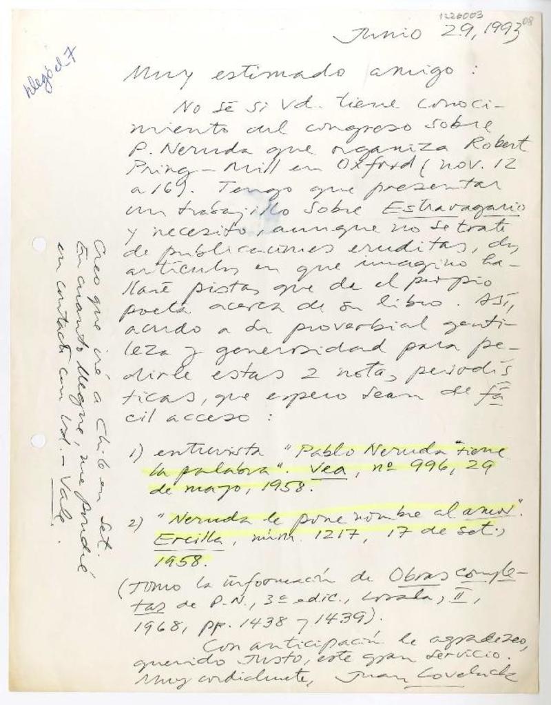 Columbia, South Carolina [a] Justo Alarcón Reyes Carta, 1993 junio 29, [manuscrito] Juan Loveluck.