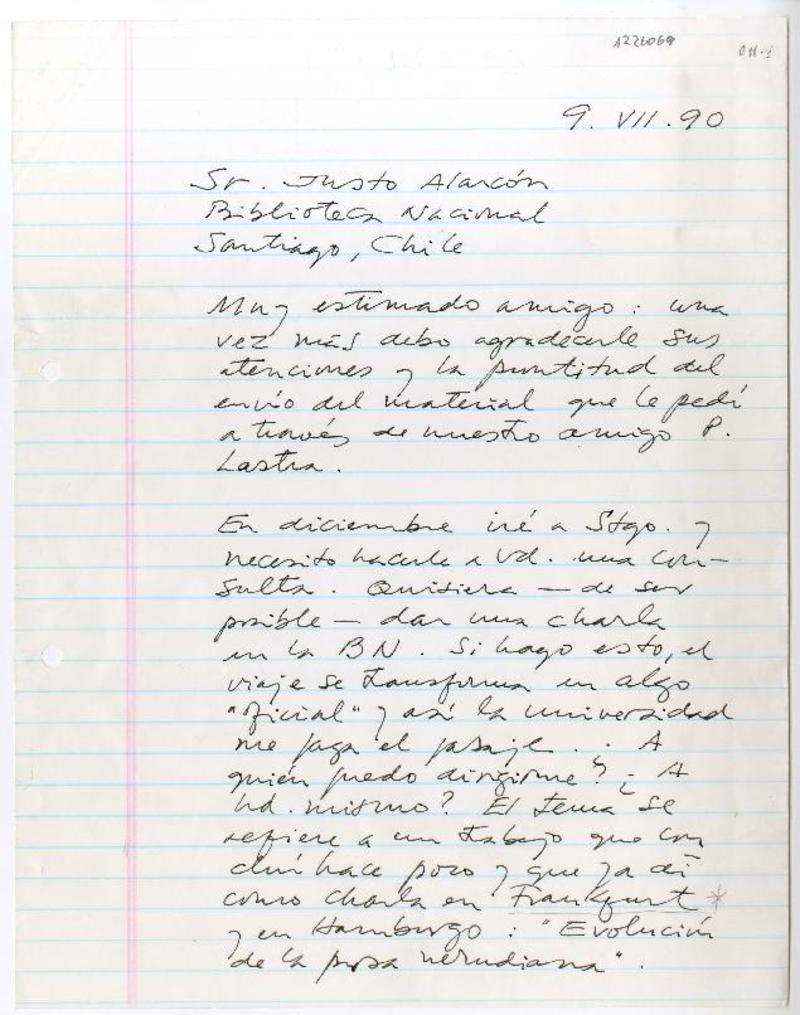 Columbia, South Carolina [a] Justo Alarcón Reyes Carta, 1990 julio 09, [manuscrito] Juan Loveluck.