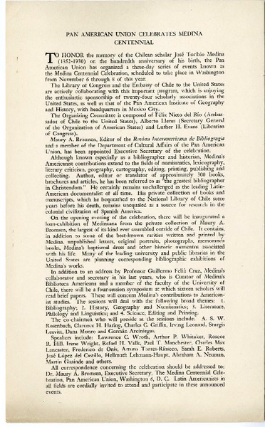Pan american union celebrates Medina centennial [manuscrito] José Toribio Medina.