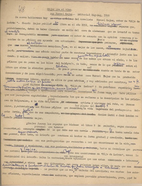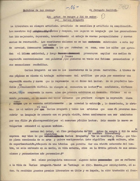 100 gotas de sangre y 200 de sudor por Carlos Droguett [manuscrito] Fernando Santiván.
