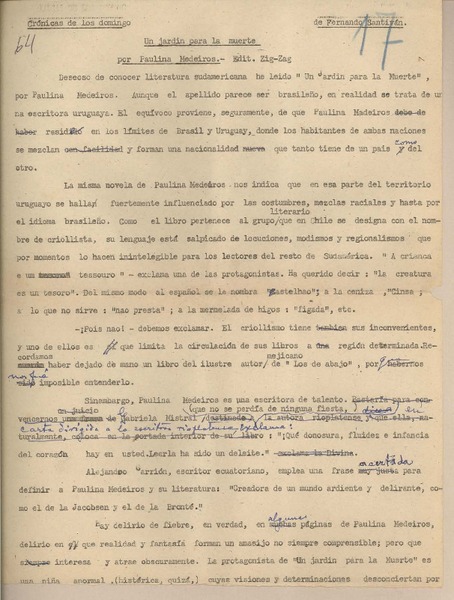 Un jardín para la muerte por Paulina Medeiros [manuscrito] Fernando Santiván.
