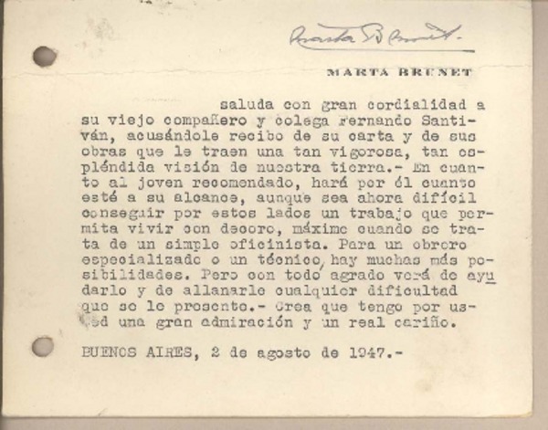 [Tarjeta] 1947 agosto 2, Buenos Aires, Argentina [a] Fernando Santiván [manuscrito] Marta Brunet.