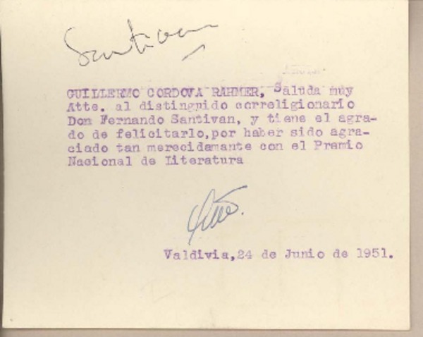 [Tarjeta] 1951 junio 24, Valdivia, Chile [a] Fernando Santiván [manuscrito] Guillermo Córdova Rahmer.