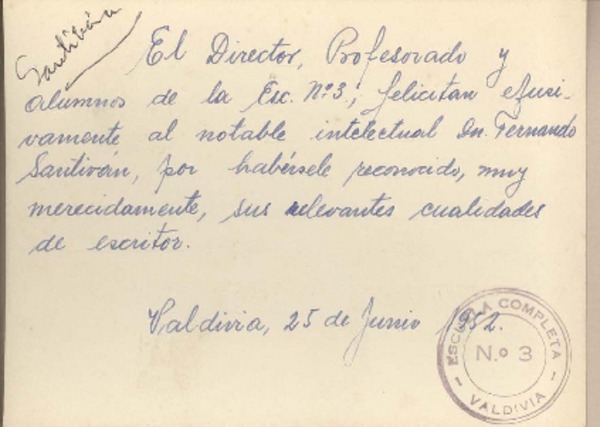 [Tarjeta] 1952 junio 25, Valdivia, Chile [a] Fernando Santiván [manuscrito] Escuela N° 3 de Valdivia.