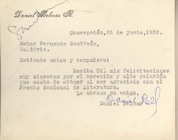 [Tarjeta] 1952 junio 25, Concepción, Chile [a] Fernando Santiván [manuscrito] Daniel Belmar.